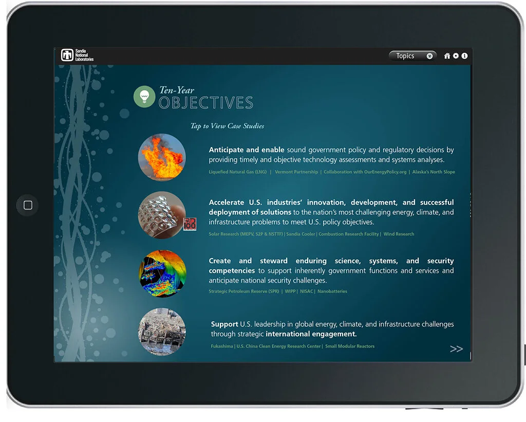 The unique touch screen application highlights C3s program and services; Sandia’s user facilities/map, interactive 3D tours; various partnership mechanisms; recent success stories, R&D100 awards; and access to Sandia’s IP library, visual patent search, and Lab Expertise. This new tool will enable staff 1) to quickly tell the Sandia story 2) engage visitors in new an interesting ways and 3) showcase the people, facilities, and IP that many people do not have access to without visiting the lab.